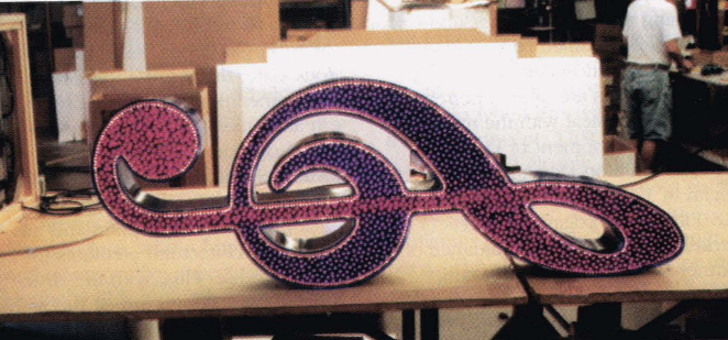 Fig. 10: Fiberoptic Lighting, Inc. (Grants Pass, OR) equipped this channel-letter “treble, end-lit fiber-optic cables to produce a unique lighting effect. The clef changes to 36 different colors in a sweeping, end-to-end motion that mimics a brush stroke.