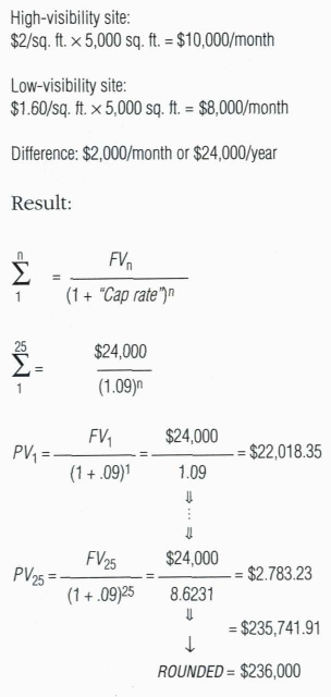 Conversely, the lessee would require the same amount of money and same interest rate, deposited over the same period of time, to recoup sales lost due to lack of optimally visible street signage.