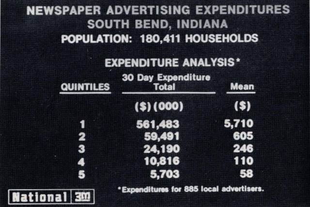 The mean or average expenditure for the top quintile on the right is $5,710. The mean or averages for the other four quintiles range from $605 down to $58. Thus, the top quintile actually accounts for 85% of the dollars spent. So, in South Bend, for all the retailers involved, most of the newspaper advertising is bought by only 20% of the retailers in the marketplace.